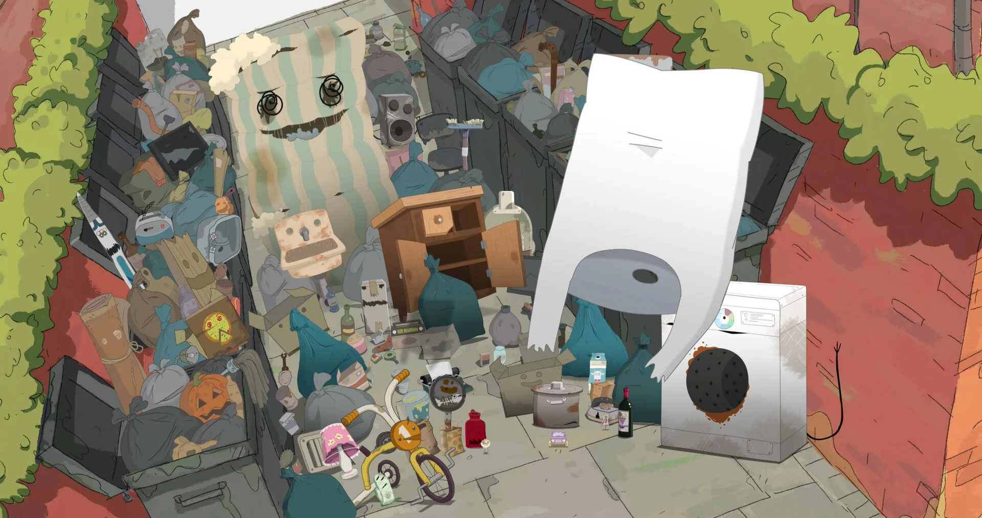 Большинство героев — вещи, которые потеряли свои основные функции, кроме элитного галстука. Его выбросил богатый мужчина, чтобы продемонстрировать своей подруге свой статус и что ему ничего не стоит выкинуть дорогой галстук, а позже купить ещё один такой. Таким образом, простая метафора о том, что даже твой внешний вид и статус не гарантируют, что ты не окажешься на помойке, превращает мультфильм в экзистенциальную притчу.