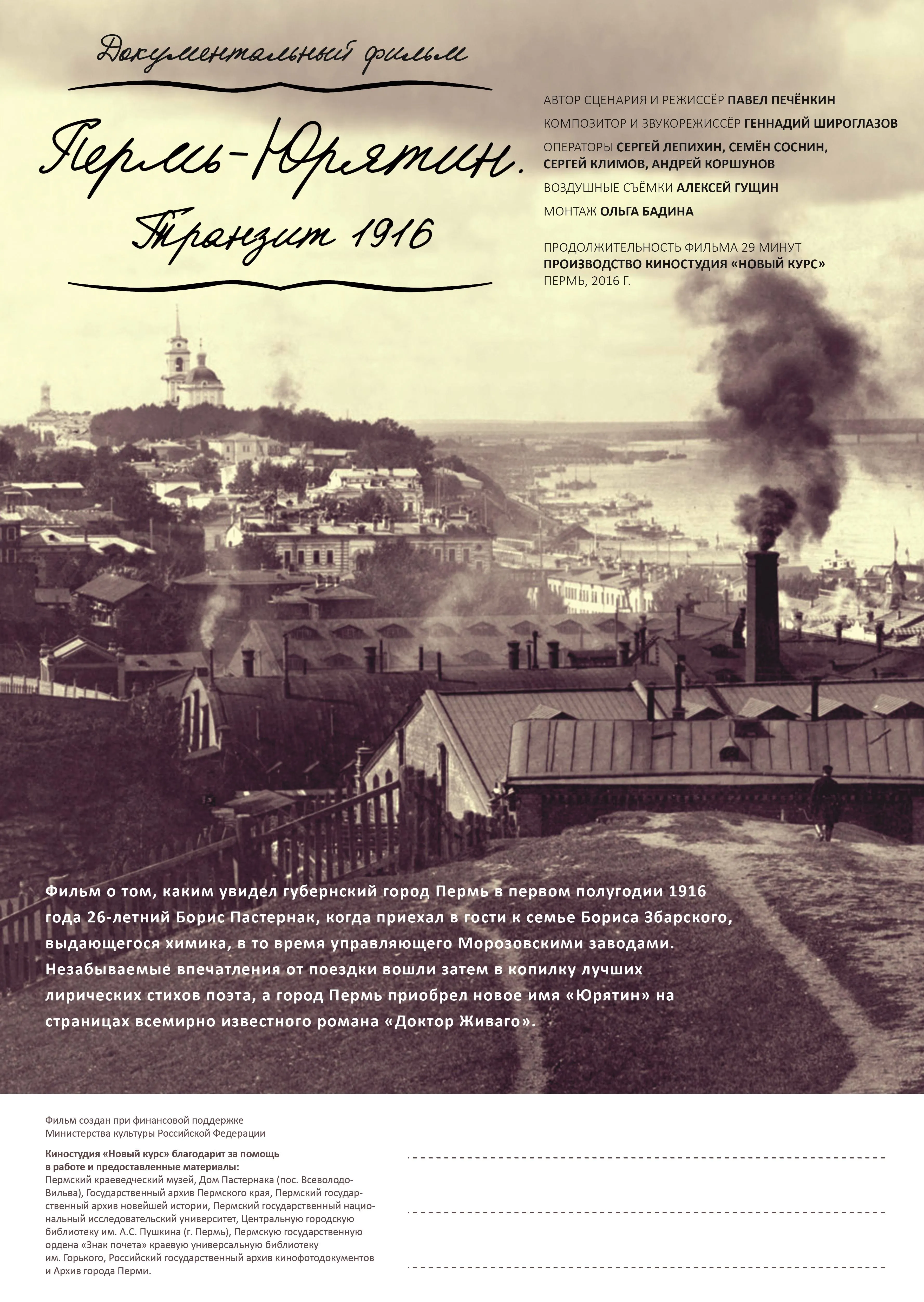 Фильм о том, каким увидел губернский город Пермь в первом полугодии 1916 года 26-летний Борис Пастернак, когда приехал в гости к семье Бориса Збарского, выдающегося химика, в то время управляющего Морозовскими заводами. Незабываемые впечатления от поездки вошли затем в копилку лучших лирических стихов поэта, а город Пермь приобрел новое имя «Юрятин» на страницах всемирно известного романа «Доктор Живаго».