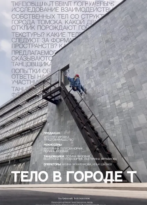 "Тело в городе Т." - это работа в жанре кинотанца, в которой танцовщики арт-группировки "ТанцТоварищество" исследуют взаимодействие собственного тела со структурами, ритмами и формами городских пространств города Томска. Данный фильм - это также попытка обнаружить и визуализировать субъективные телесные отклики на элементы той среды, в которой мы существуем ежедневно.